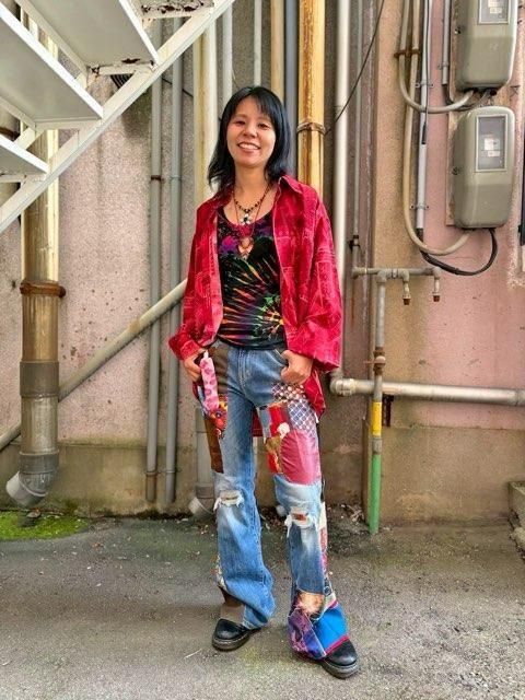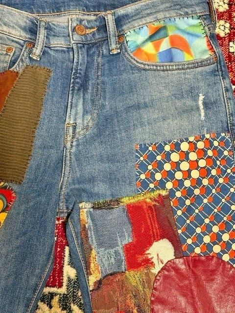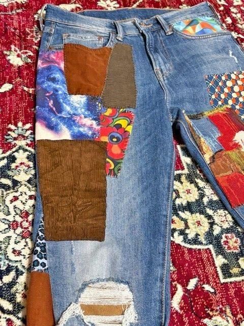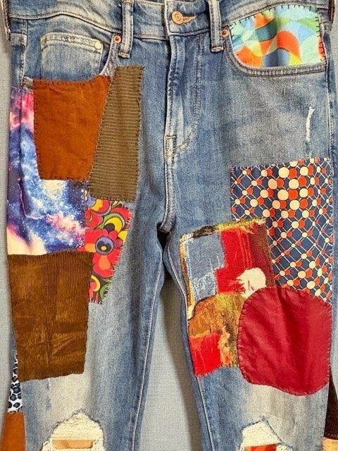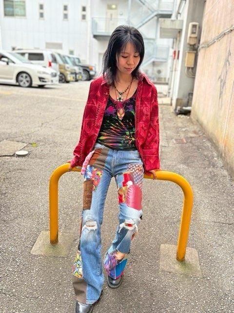 ダメージとカラフルなパッチが絶妙にマッチして、穿くだけで主役になれる1本です。