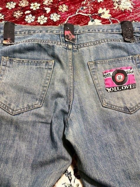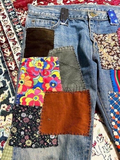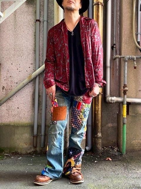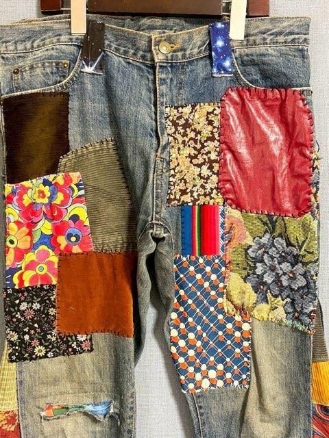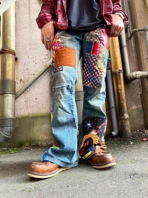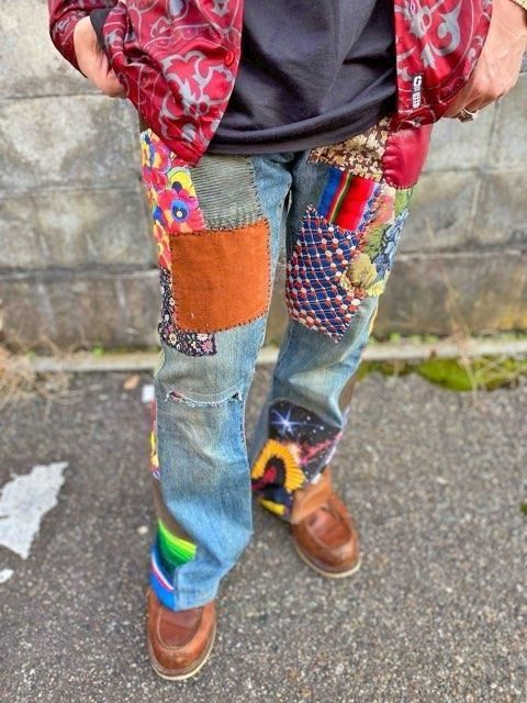 ダメージとカラフルなパッチが絶妙にマッチして、穿くだけで主役になれる1本です。