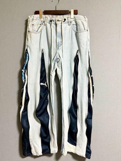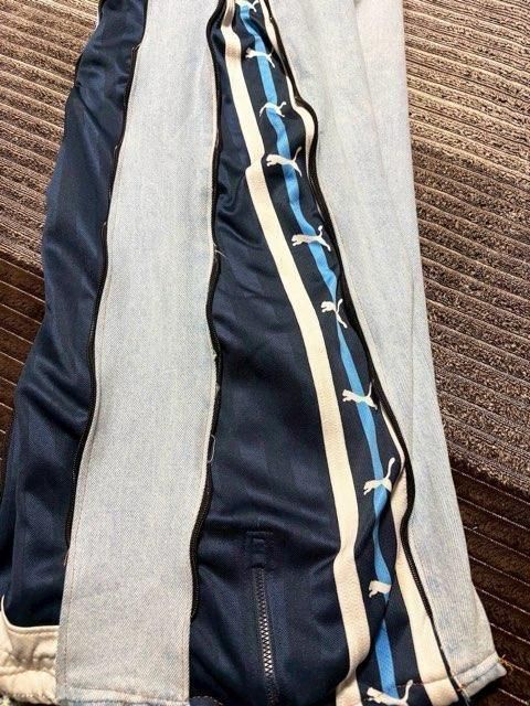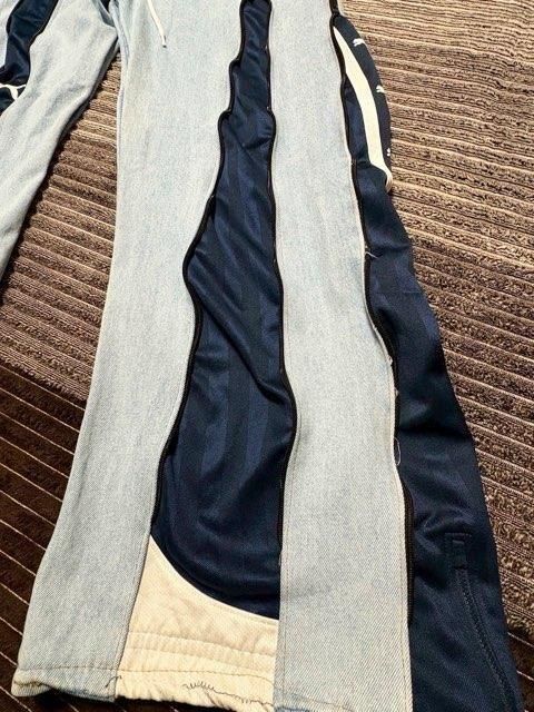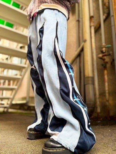 ジャージ素材を大胆に組み合わせたリメイクデニム。