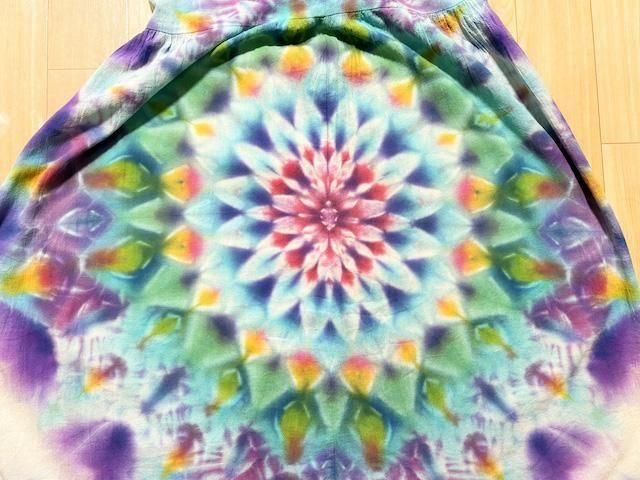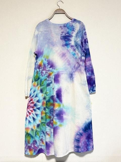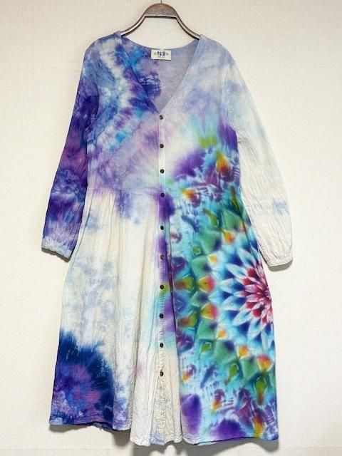 タイダイ染め 前開きのロングワンピース 美しいブルーパープルのムラ染めに幻想的な大曼荼羅